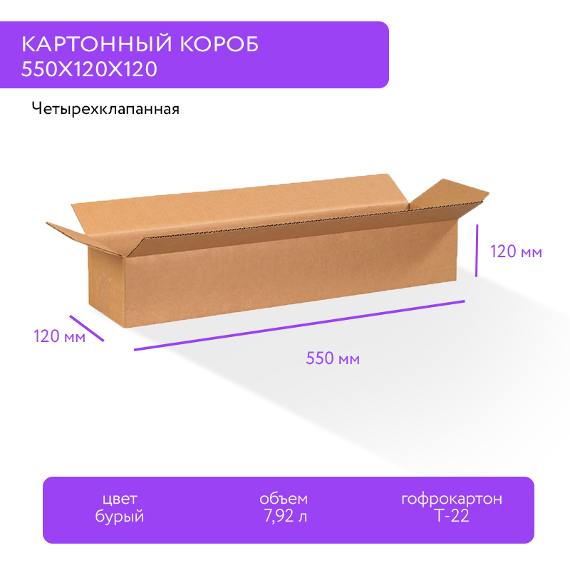 Обратитесь к каталогу на сайте good-pack.ru. Выберите Картонный короб 550x120x120, Т-22В, 0201. Посмотрите описание товара и его цену.